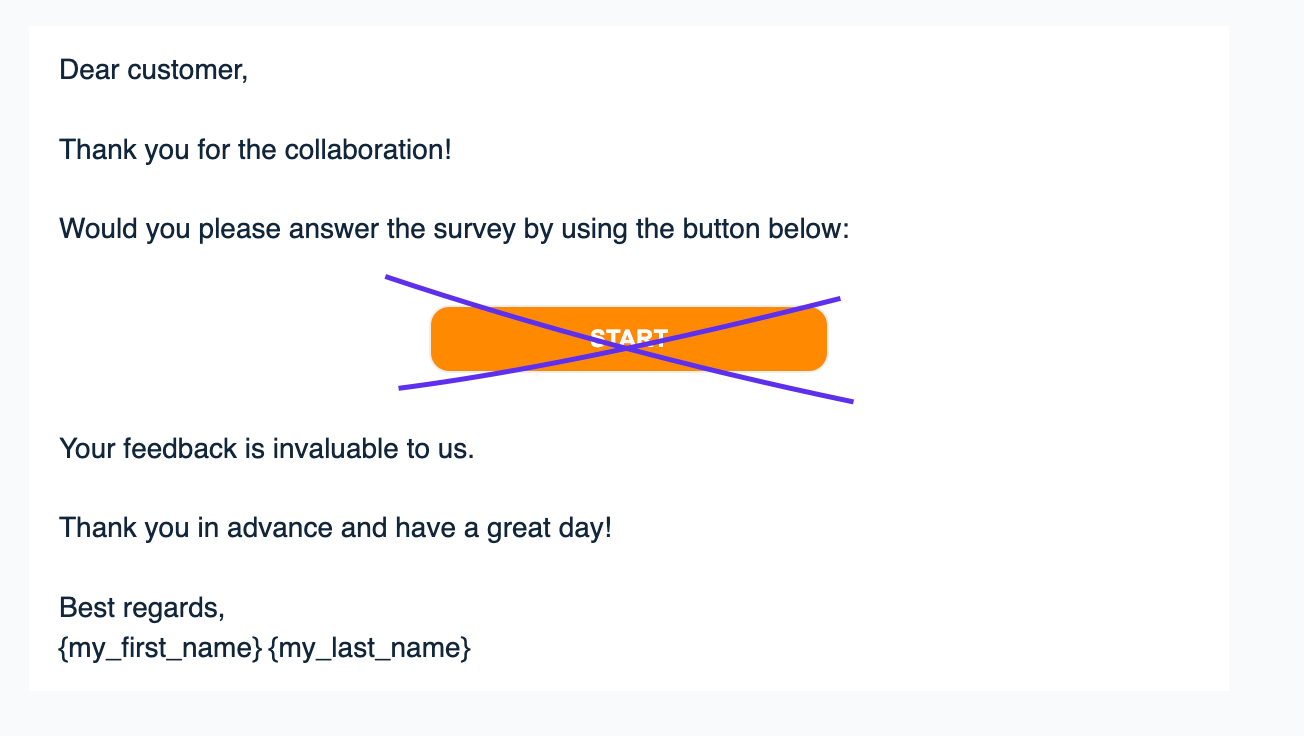 Normally, an email invitation has a START button to start the survey (picture below), but in this case, when you want to add the NPS question directly to the invitation message, we recommend removing the START button.
