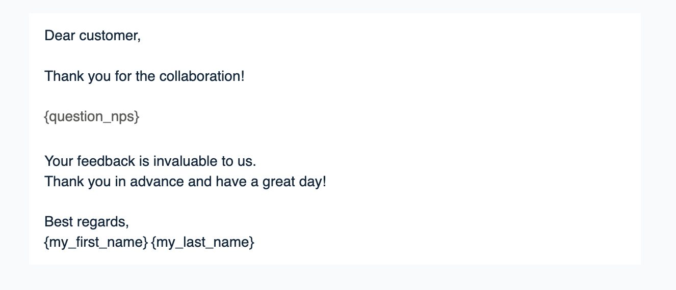 You can add an NPS question to an email invitation by adding the text {question_nps} to the invitation message (image below). In an employee survey, the same text {question_nps} works for the eNPS question.