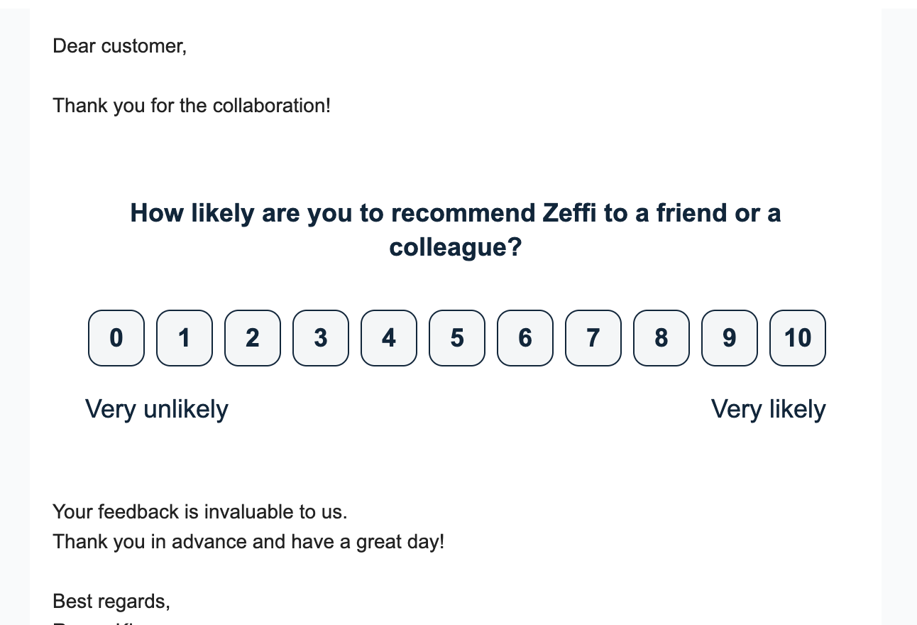 You can add the NPS question directly to the email invitation message. In this case, the respondent can answer the NPS question by clicking 0-10 in the invitation and the survey will open in a new tab automatically.